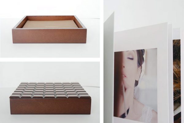 Contenitore in legno fatto a mano per contenere Fine Art Book 25×25 cm con cover tessuto e incisione nomi dorata.